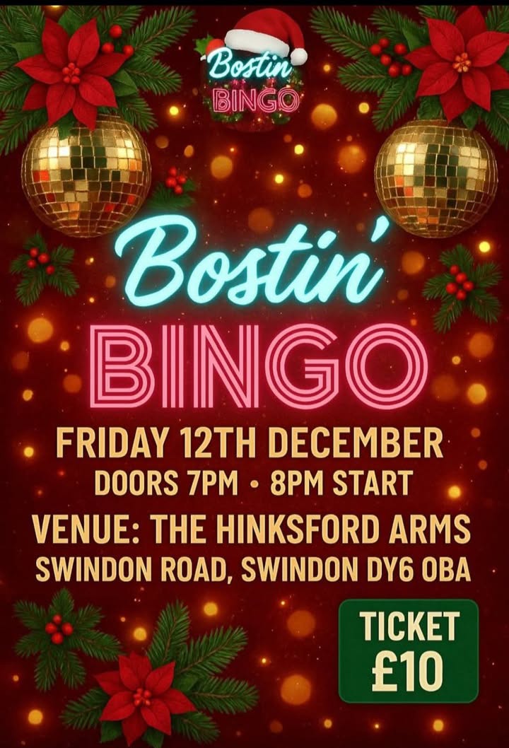 BOSTIN BINGO at The Hinksford Arms. This is one not to be missed ! Get right into the Christmas spirit with this wacky BOSTIN BINGO event. Friday 12th December - Door open 7pm - Eyes wide open at 8pm 👀 TICKET ONLY 🎟️ £10 per person Get in there fast as this is guaranteed a sell out night 🤯